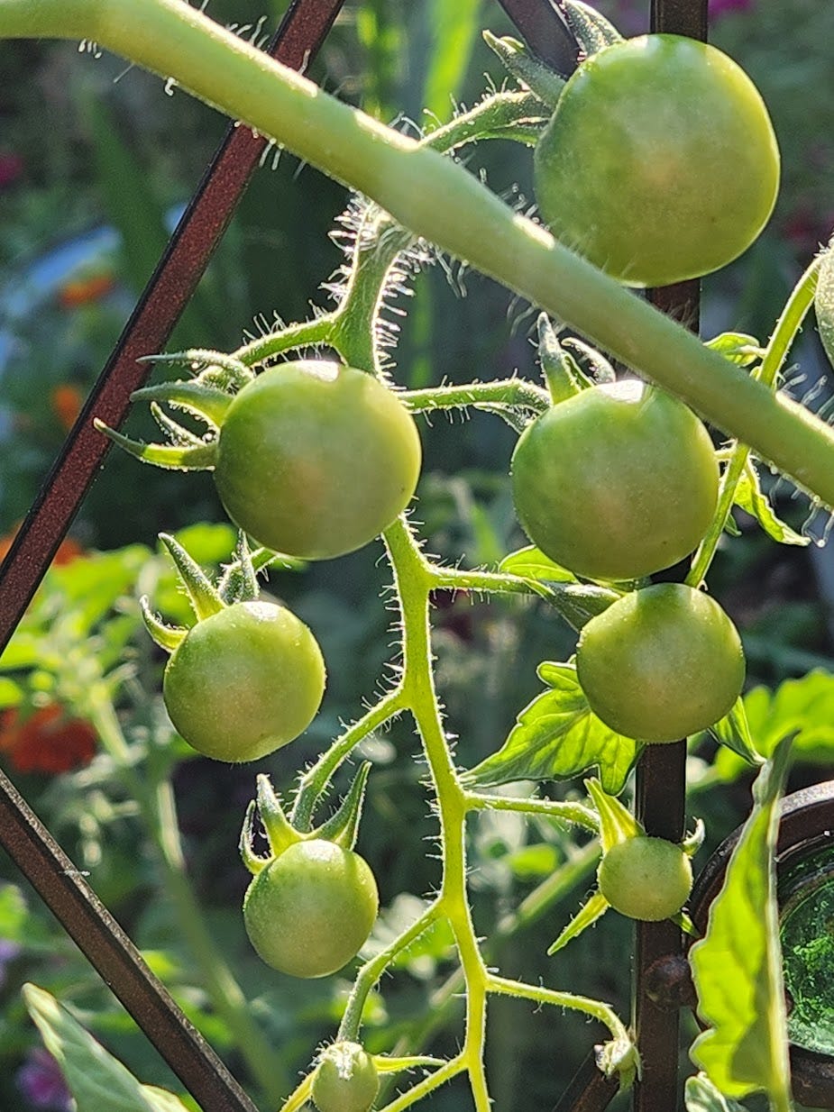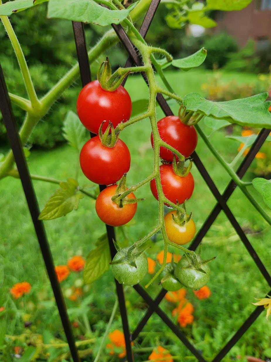 Because they spread, indeterminate tomato plants need supports and those should be in place while the plant is still fairly small so you don’t disturb the roots. Tomato cages are fine, but you can use anything that will help the plant stay upright (bamboo and twine, sticks, DIY whatever you want.) I use colorful cages and decorative supports because I like whimsy but the plant does not care!